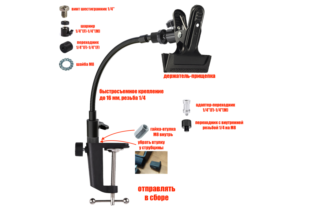 - Гибкое быстросъемное крепление до 16 мм, резьба 1/4 - 1 шт;