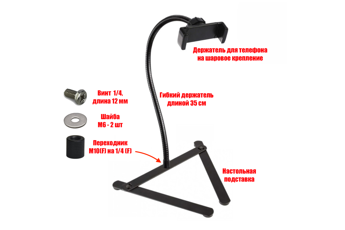 Настольная подставка для телефона на гибком креплении подойдет для плоских поверхностей. Такой держатель телефона является универсальным вариантом надежной фиксации мобильного устройства. Подставка для смартфона позволяет расположить устройство в любом удобном месте: на столе, подоконнике, на стуле или табурете, на любой другой ровной поверхности. Держатель используется как подставка держатель телефона с возможностью регулировки угла наклона и поворота, что позволяет подобрать идеальное положение для просмотра фильмов и сериалов, для фото и видео съемки. Такой держатель телефона отлично подойдет для съемки видеоблога, просмотра кулинарных и других мастер классов.