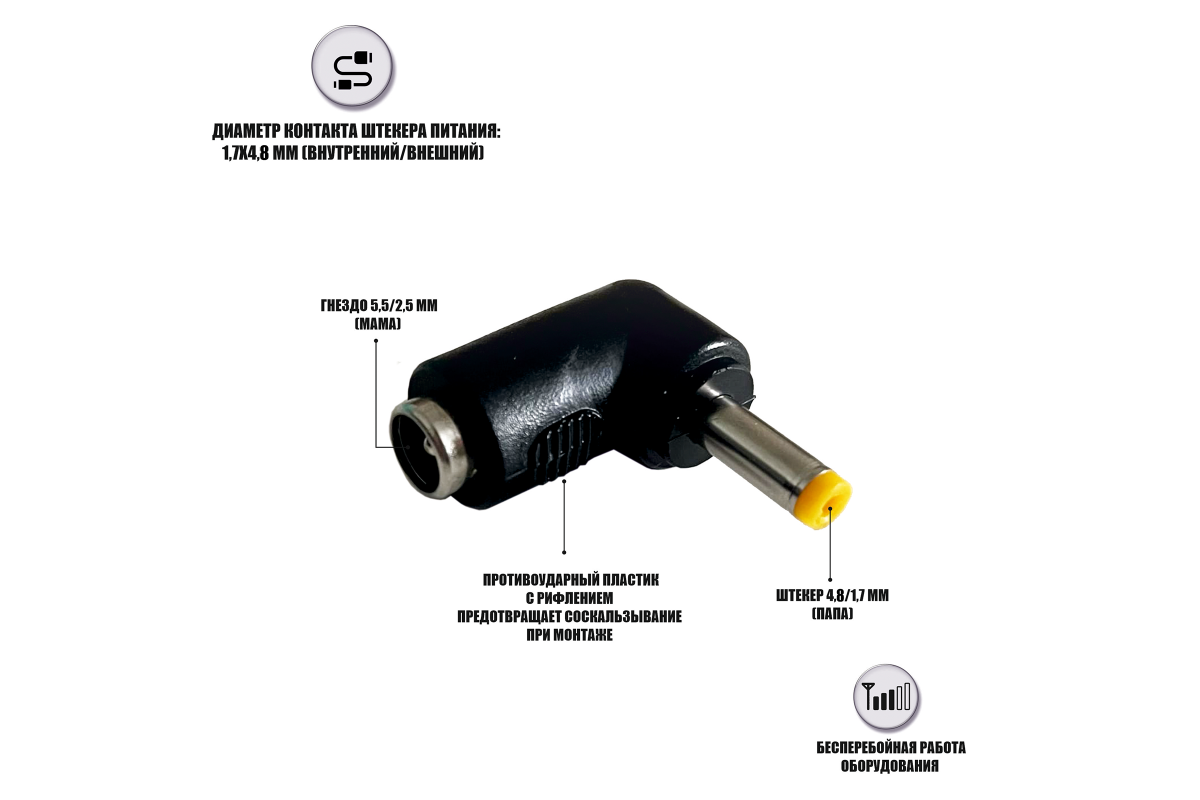 - Переходник DC гнездо 5.5/2.5 мм (мама) - штекер 4.8/1.7 мм (папа), угловой, может использоваться в нетбуках HP & Compaq.