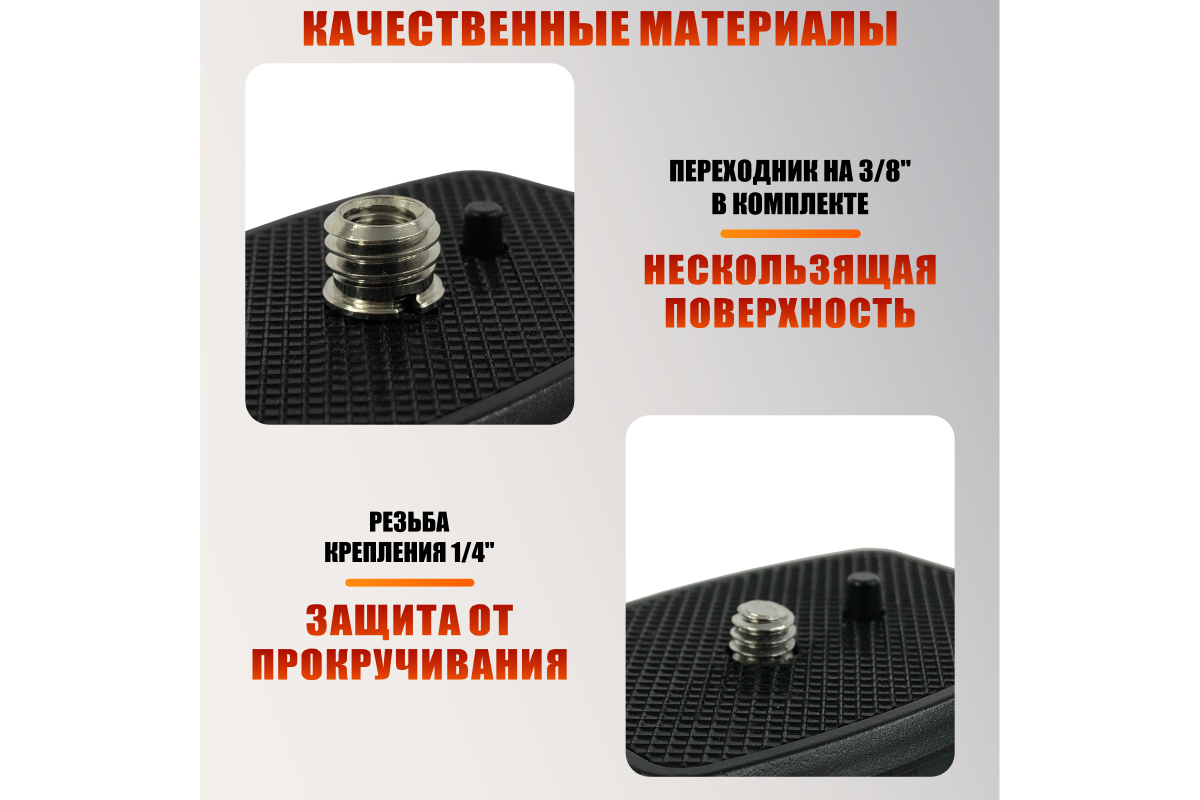 Быстросъемная площадка BH-6 — отличное решение для фотографов и видеографов, стремящихся к максимальной эффективности и удобству в работе. Эта площадка оснащена ребристой противоскользящей поверхностью, что обеспечивает надежное удержание вашего устройства на штативе даже в самых сложных условиях. Защита от прокручивания гарантирует стабильность и безопасность при съемке, позволяя вам сосредоточиться на творческом процессе. Встроенный винт с ушком для крепления камеры обеспечивает легкость и быстроту установки, а переходник с 1/4 на 3/8 в комплекте делает площадку универсальным инструментом, совместимым с различным оборудованием. Быстросъемная конструкция позволяет вам мгновенно и оперативно сменить оборудование, не теряя время.