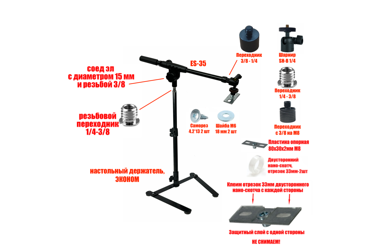 - Соединительный элемент для крепления наклонного держателя к штативу с диаметром отверстия 15 мм и резьбой 3/8 - 1 шт