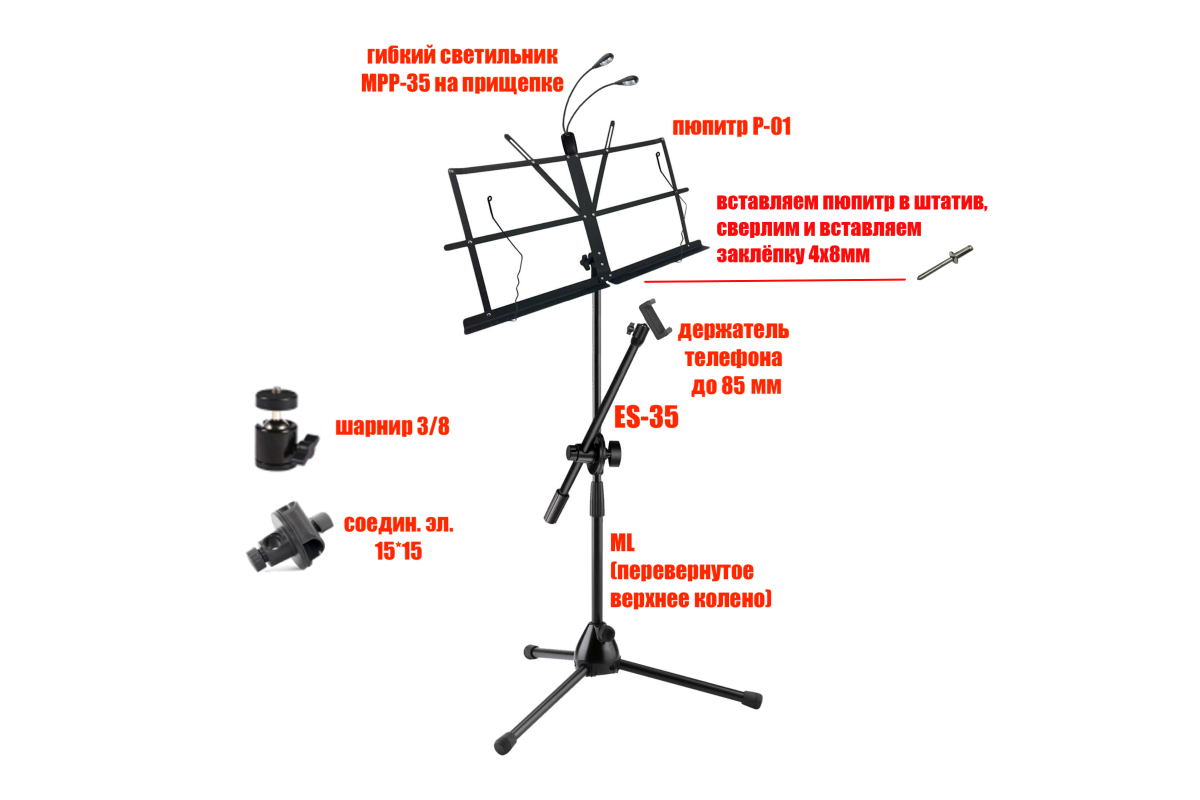 Подставка для нот PML-01-DT85 складной пюпитр на стойке с держателем для телефона и подсветкой MPP-35 на прищепке