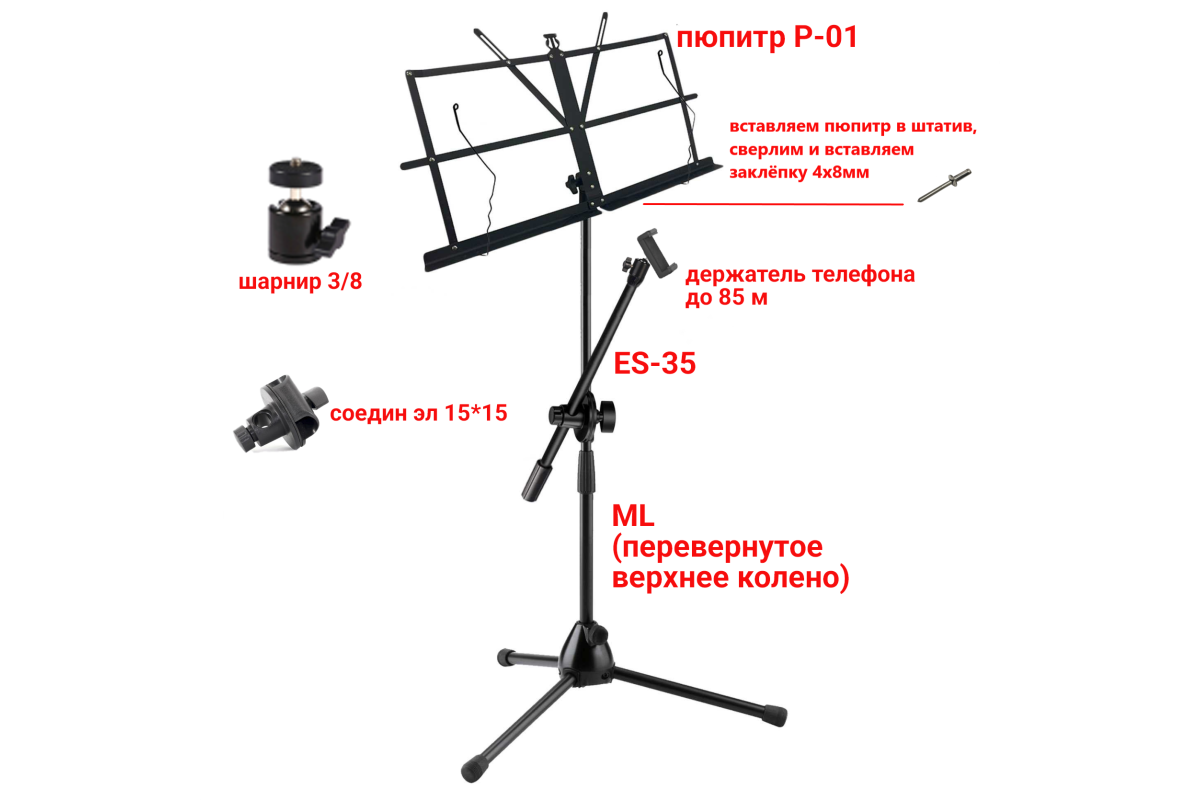 Подставка для нот PML-01-DT85 складной пюпитр на стойке с держателем для телефона на шарнире