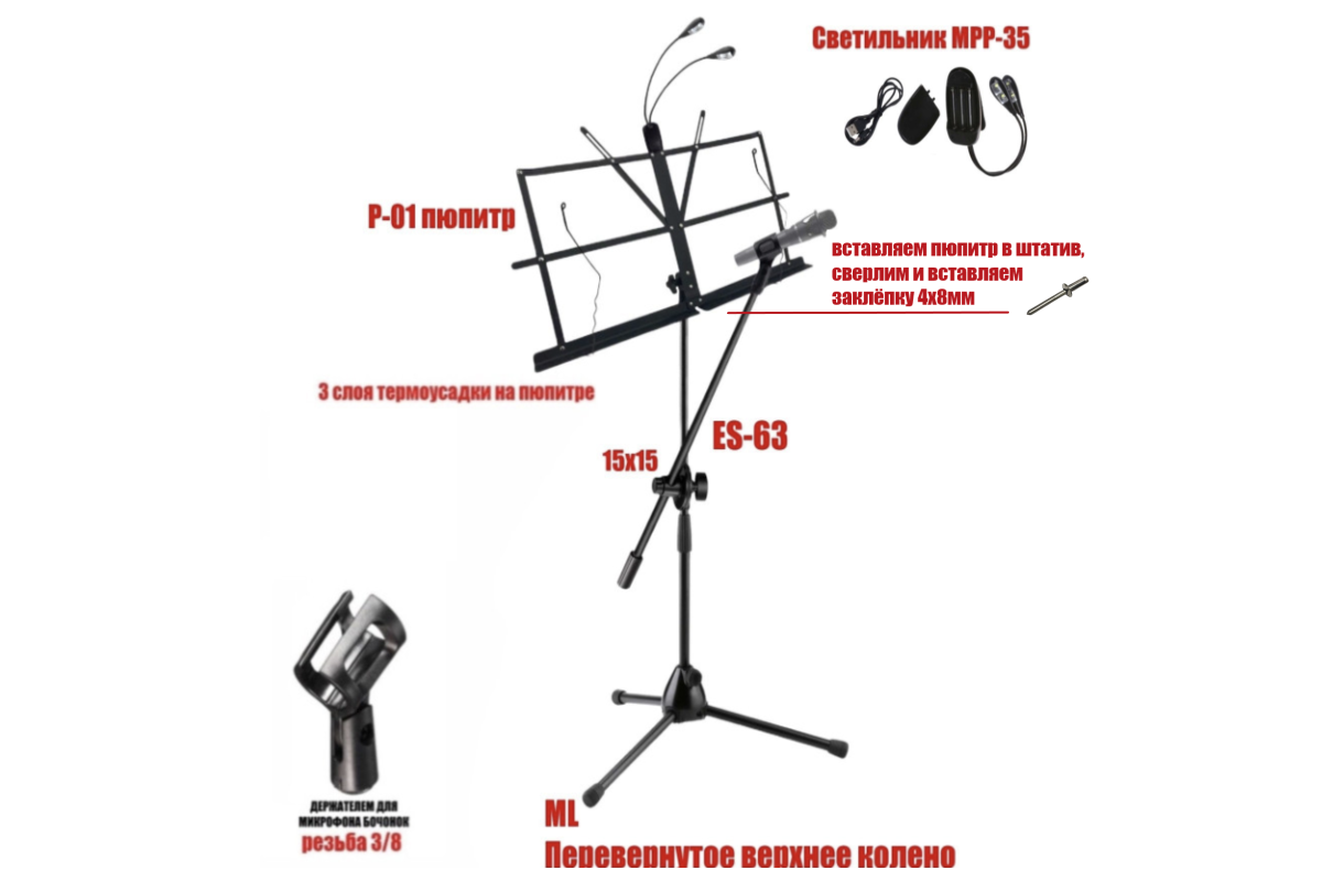Подставка для нот PML-01-DВ складной пюпитр на стойке с держателем для микрофона бочонок и гибкой подсветкой MPP-35